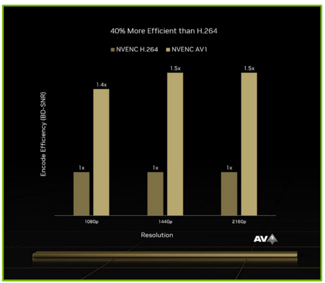 AV1编码作为面向未来的编码方式,能够有效节省网络带宽,相对于传统的编码效率方面提升非常多,对于内容创作和流媒体时代,有着非常大的帮助,全新的RTX 40系列显卡同样支持AV1解码器,对于内容创作者和直播用户来讲,能够大大提升效率。