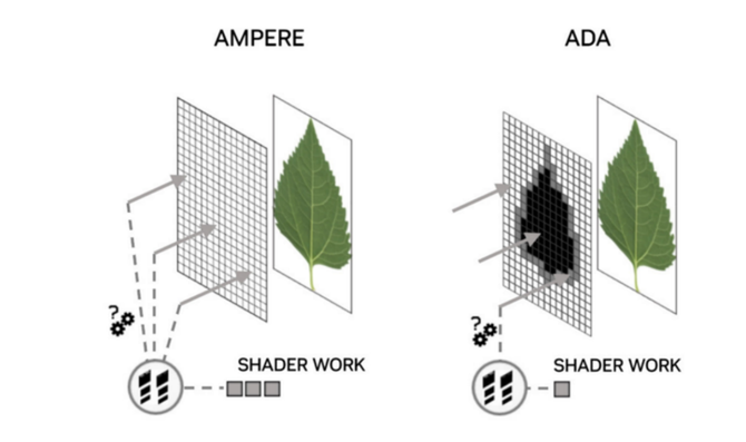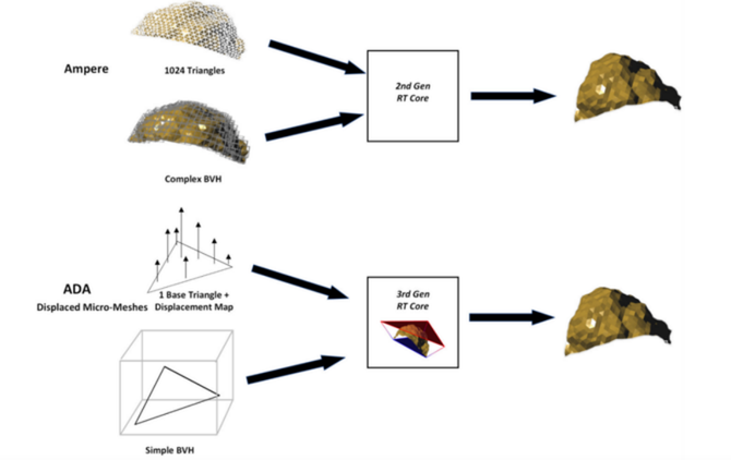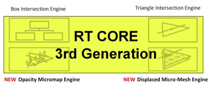 全新的第三代RT核心在性能方面相对于上代提升2.8倍,达到191TFLOPS,其内部包括了用于加速边界体积层次(BVH)数据结构遍历的加速单元,去执行射线三角形和光线边界框相交测试计算,这也是目前公认的最!高效的光线追踪计算方式,另外本次还加入了还引入了称为“微映射透明度引擎”(OMM)和“微网格置换引擎”(DMM),可以优化光线追踪渲染效率,使得不规则的图形和半透明的对象都能更快更好地被渲染出来。