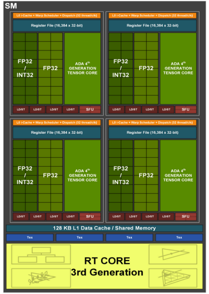 在更进一步的SM单元架构图上,我们可以看到,每个SM单元内有4个主要计算模块,一个RT光追核心、以及128KB的一级缓存。