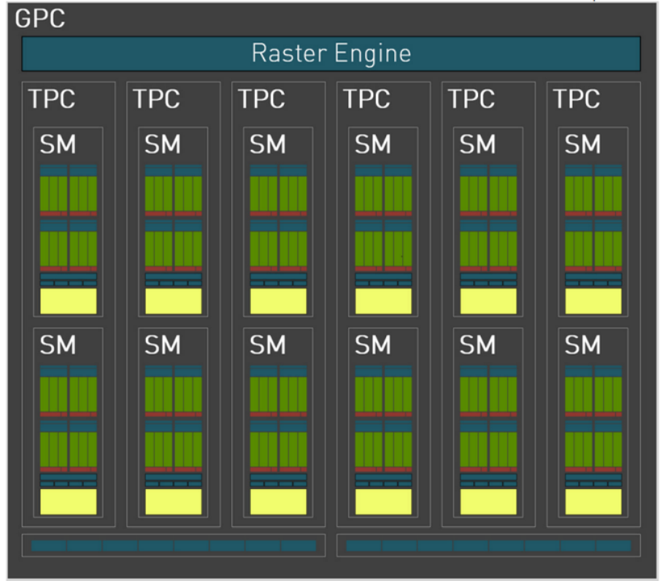 接下来我们看GPC架构图,这一代的GPC每组依然由6组TPC、一个独立光栅引擎和两个ROP分组组成,其中每组TPC里面又包含2组SM单元,这样的架构和上代Ampere保持一致。