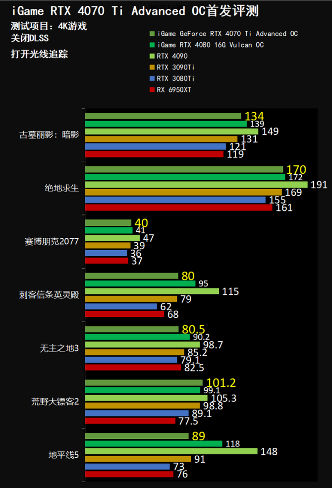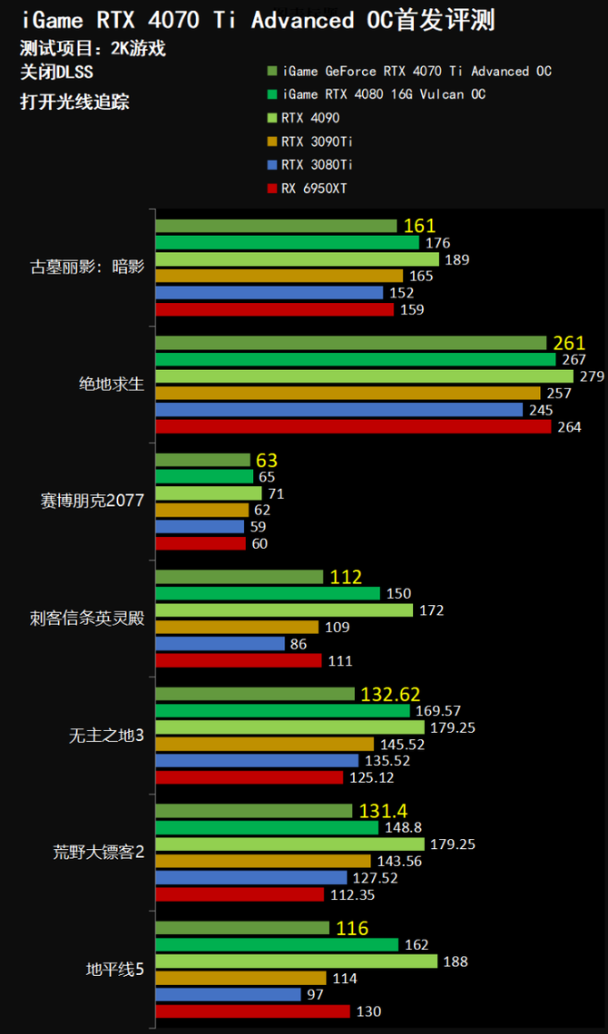 2K游戏性能方面,我们选择了几款代表性的游戏大作,游戏画质在游戏内选择最 高,另外关闭DLSS,最终得到的成绩如上图所示,基本上iGame GeForce RTX 4070 Ti Advanced OC游戏性能超过RTX 3090 Ti,并且大幅领先RTX 3080 Ti,和RTX 4080的性能没有拉开特别大的差距,基本上能够实现2K分辨率下超过120FPS的游戏体验,游戏效果出色。