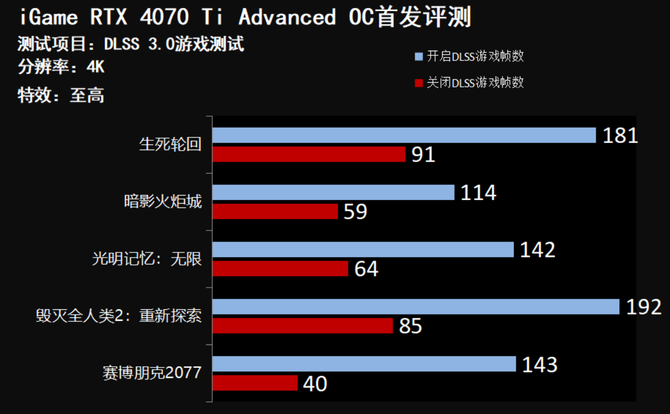 除此之外,在游戏方面,我们选择了几款支持DLSS 3.0的游戏,在开启DLSS之后,游戏的帧数暴涨200%以上,在这项技术的加持下,iGame GeForce RTX 4070 Ti Advanced OC的游戏帧数要大幅领先上代的RTX 3090 Ti,为玩家提供出色的游戏体验。