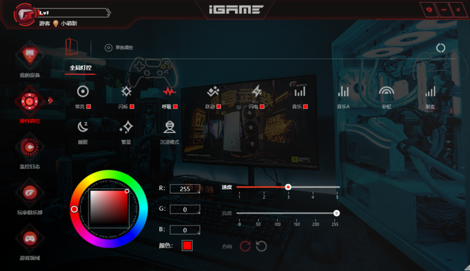 同时在iGame Center控制软件中,我们可以调整灯光效果,操作非常简便,并且可以自定义灯光变换效果和灯光色彩,可玩性十足。