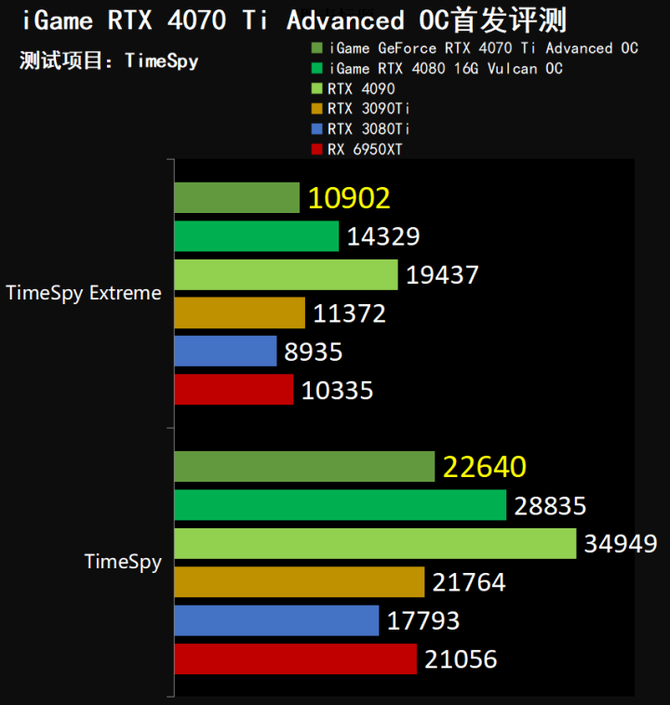 TimeSpy项目中,iGame GeForce RTX 4070 Ti Advanced OC同样领先RTX 3090 Ti,性能表现出色,达到22640的分数,在DX12游戏性能上有着较大的优势。