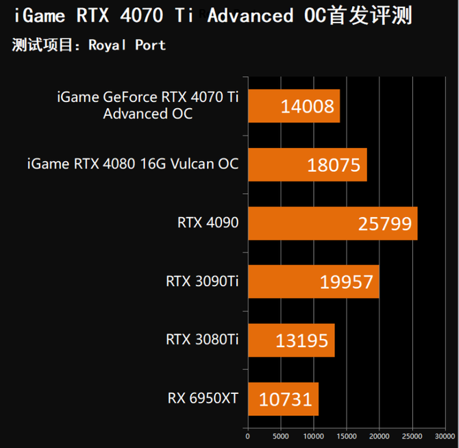 3DMARK光追性能测试Royal Port环节中,我们可以看到,iGame GeForce RTX 4070 Ti Advanced OC的性能表现领RTX 3080 Ti,落后RTX 3090 Ti。