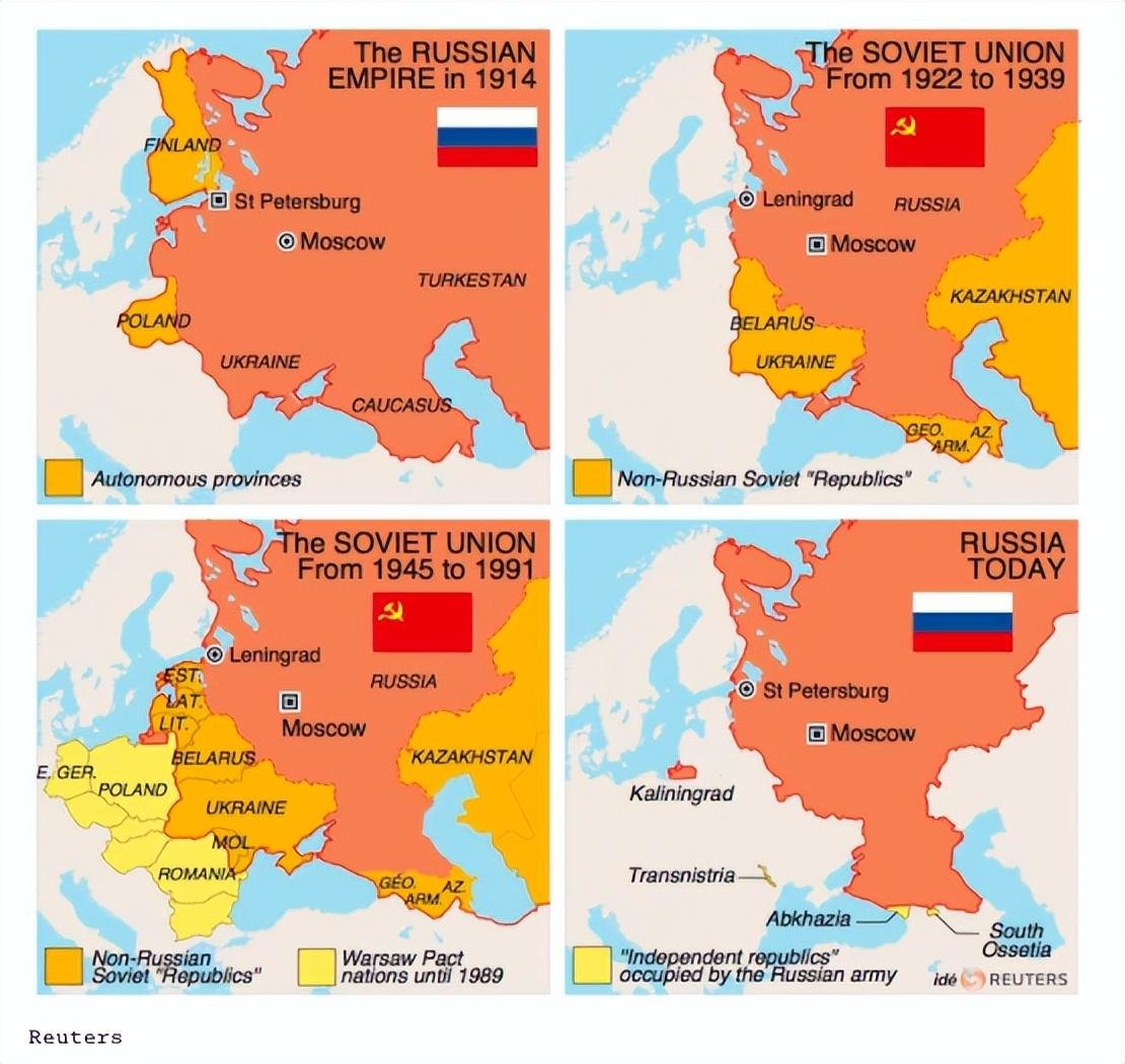 而最近一百年的历史上,毛子则是一直在丢失领土。俄国人打输了一战之后,陷入了内战,早期吞并的那些领土,都各自独立了。后来苏俄成立,又逼着这些小国重新归附了苏联。到后来苏联解体,这些小国又独立了,变成了现在的局面。