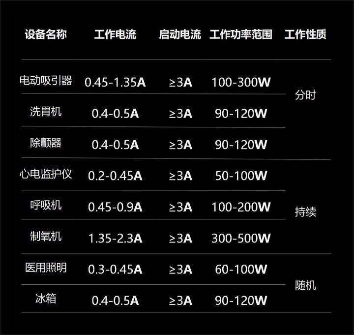 救护车上装备有监护设备、治疗设备、消毒设备和其它先进的医疗设备。国内常用急救设备电标准被AC220V,50Hz,设备在AC220V供电情况下的功耗见下表: