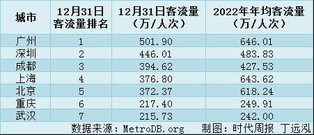 广州取得2022年末的地铁客流量“第一名”,成都也在最后一天超过北京和上海的地铁客流量,以394.62万人次位居第三。