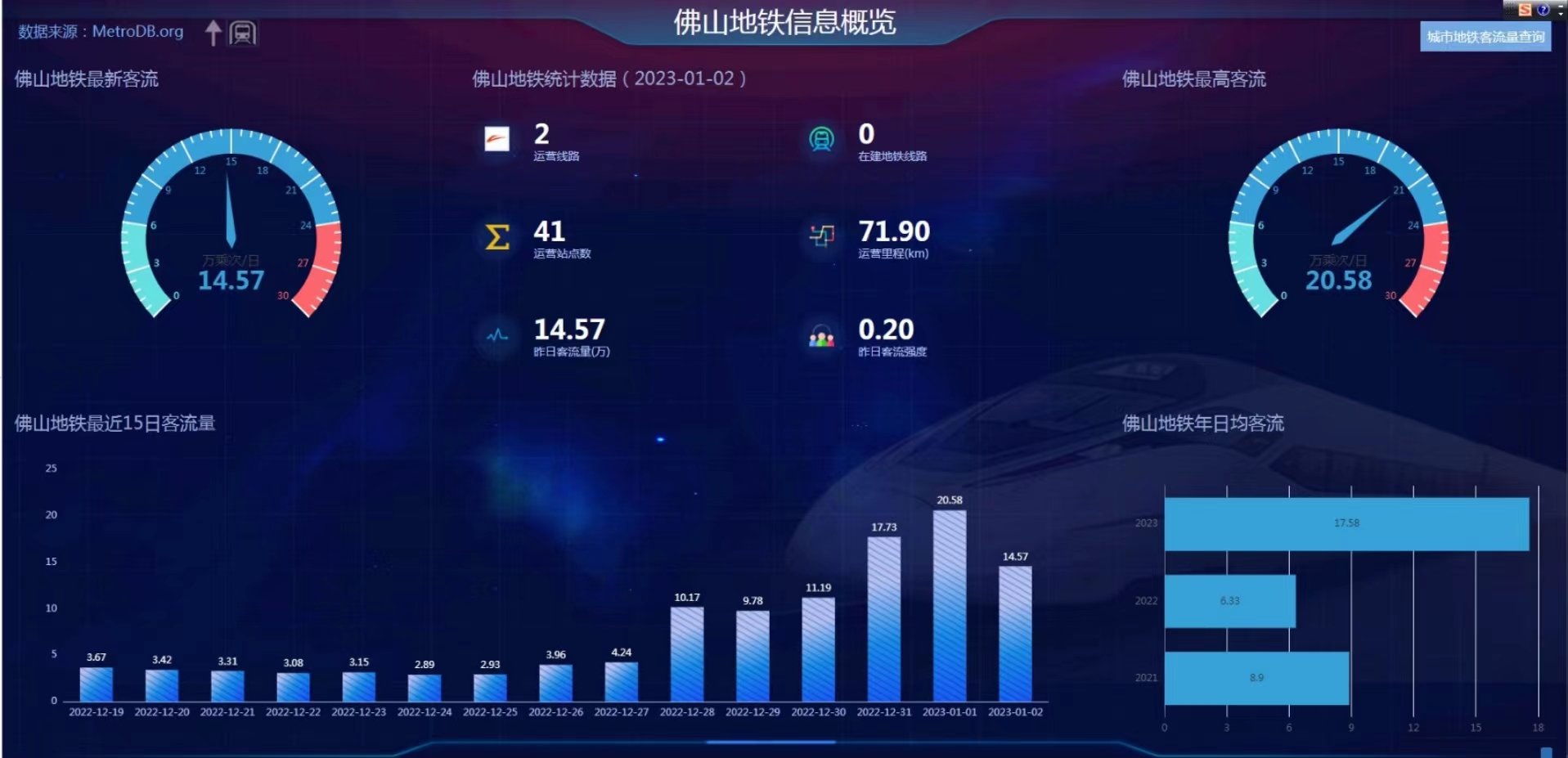 地铁客流量超过200万的城市均未实现在2022年12月31日创造年内最高记录,不过,佛山这座“后起之秀”凭借着17.73万人次(不包括广佛线)的地铁客流量创造该市历史记录,2023年1月1日,佛山地铁客流量更是突破20万人次。