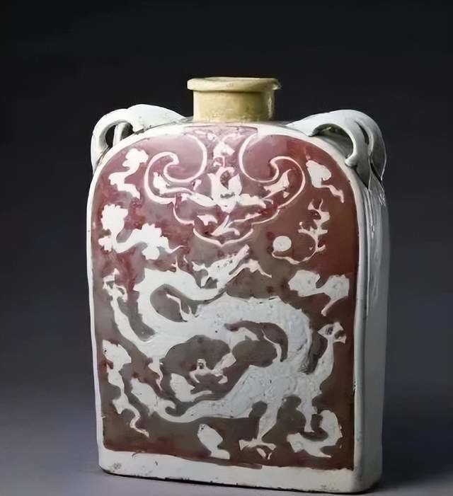 元代 釉里红地白花暗刻云龙纹四系扁壶 高34cm,口径8.5cm,足横26.5cm,足纵8.2cm。釉里红也叫“元紫”或“钧紫”。一般人把釉里红归属为“铜红系釉”,以铜化合物为着色剂。釉里红绘制在生坯上后,需再罩上一层与之匹配的青白釉以1280℃至1320℃温度烧成。(注:一般情况下,很多人都把产生于宋代、盛行于元代、并在元代成为名贵品种的釉里红看作是颜色釉的一种,但是,从严格意义上来说,釉里红不是颜色釉,而是一种以氧化铜为着色剂的色料。釉色红黑之中泛紫;在高温窑火中易流动,呈色及其不稳定。是元代景德镇著名的釉下彩绘色料。
