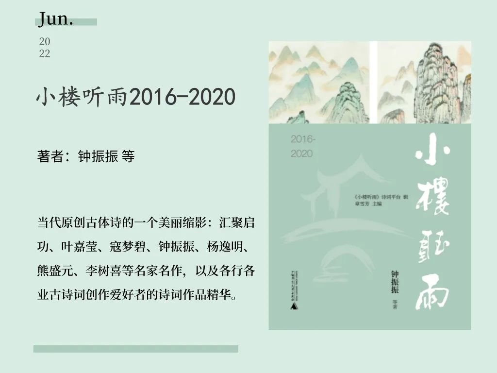 本书为《小楼听雨》创刊四周年旧体诗作品集粹:不仅收录有钟振振、梦欣、杨逸明等专家当代诗词创作理论及诗话,还精选2016年7月至2020年12月已在“小楼听雨”诗词平台公开发表的当代诗人古诗词原创优秀作品、小楼主办的诗赛作品,共456家780首左右。