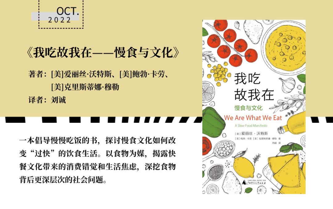 本书以作者大学时代、餐厅工作、社会活动等经历为线,展示了一种新的饮食理念和生活方式。书中上半部分揭露了快餐文化带来的消费错觉和生活焦虑,并深挖食物背后更深层次的社会问题,如广告盲目渗透、儿童用餐娱乐化、反季食品泛滥成灾、粮食浪费严重等。下半部分以食物为探讨核心,生动展示了生物多样性、时令、食物美学等慢食价值观;探讨慢食文化如何改变“过快”的饮食生活,如何用饮食去关爱、 照料自己身体和感官。有了“我吃故我在”的提醒,人们才得以反思弥漫着不快乐的底色和廉价的麻醉剂的工商业文化。