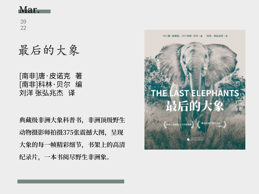 一本典藏级非洲大象科普书,带你阅尽非洲野生象。书中通过40多名研究人员、动物保护主义者、护林员等多样的视角,讲述了非洲象群的生活和大象的生存现状。既展现大象可爱、智慧的一面,也揭露了大象被残忍杀害、象牙被偷猎的惨状,还有非洲大陆上人们为大象生存和福祉做出的不懈努力。