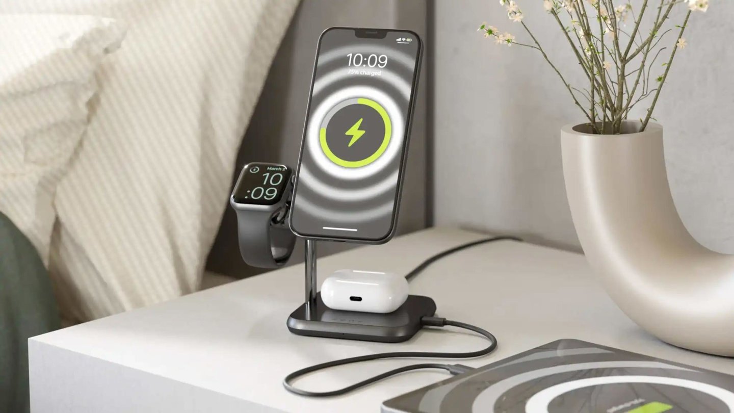 这款多设备充电器采用黑色铝质设计,可给配备 MagSafe 的 iPhone、AirPods、Apple Watch 和配备 USB-C 扩展坞的 iPad 充电。