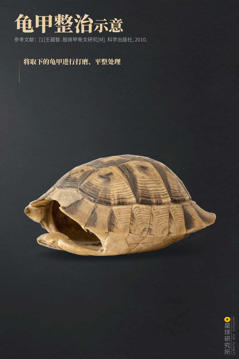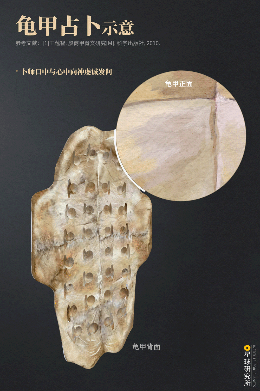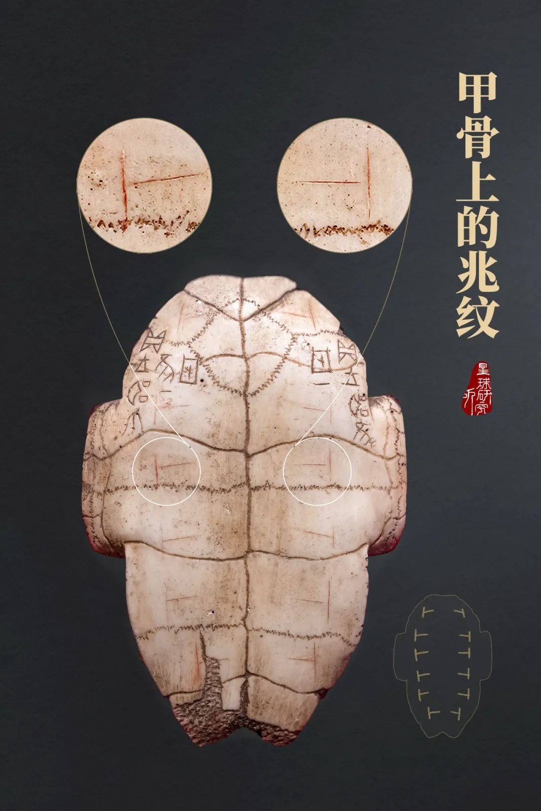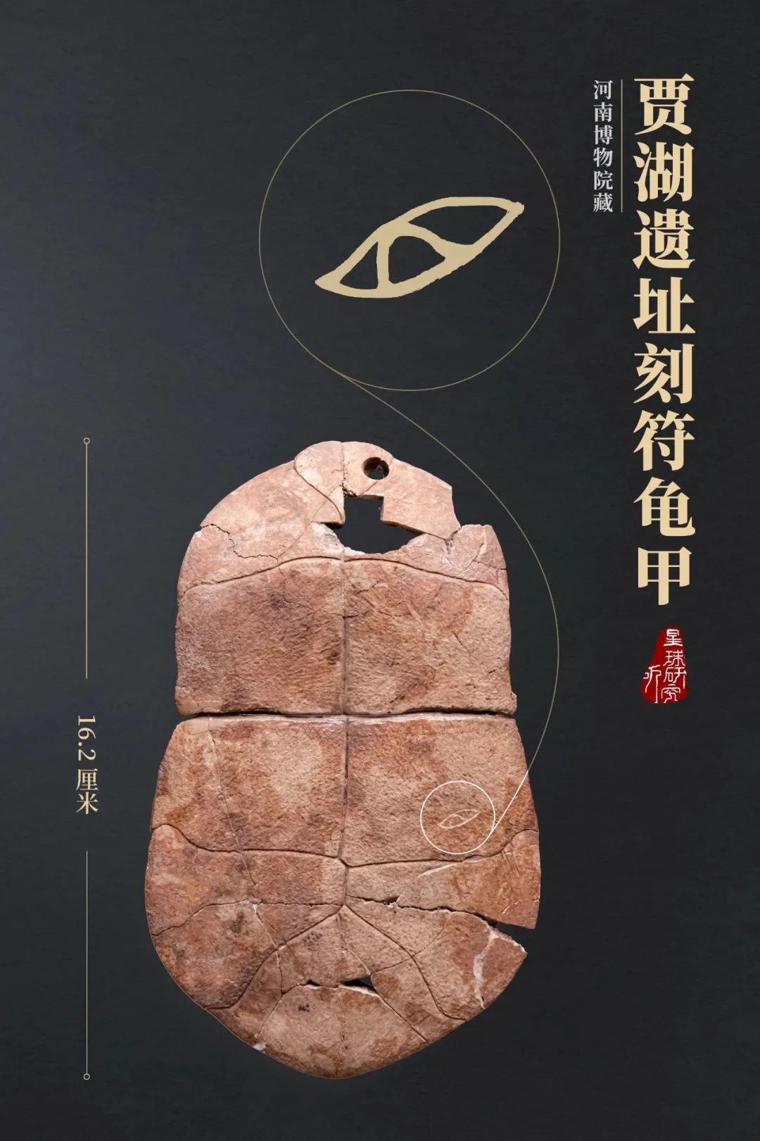(贾湖遗址刻符龟甲,为龟腹甲,其上的符号像一只眼睛,具体含义已不可知,摄影师@包浩霖,制图@刘志鹏/星球研究所)