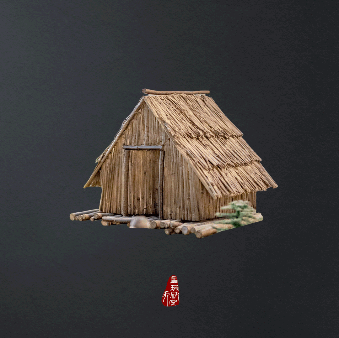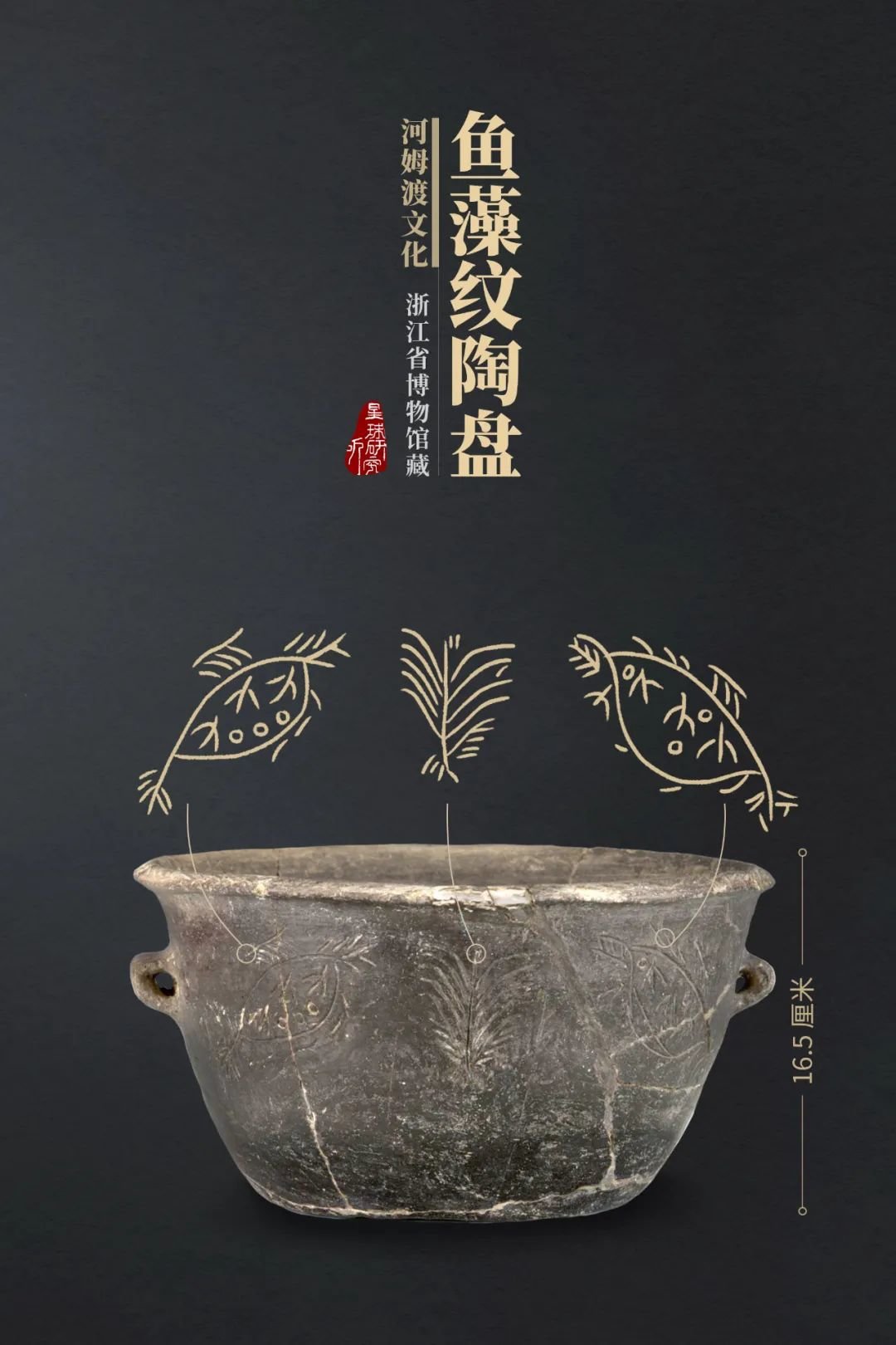 (河姆渡文化鱼藻纹陶盘,图案可能为鸟和藻类植物,图片来源@浙江省博物馆,制图@龙雁翎&刘志鹏/星球研究所)