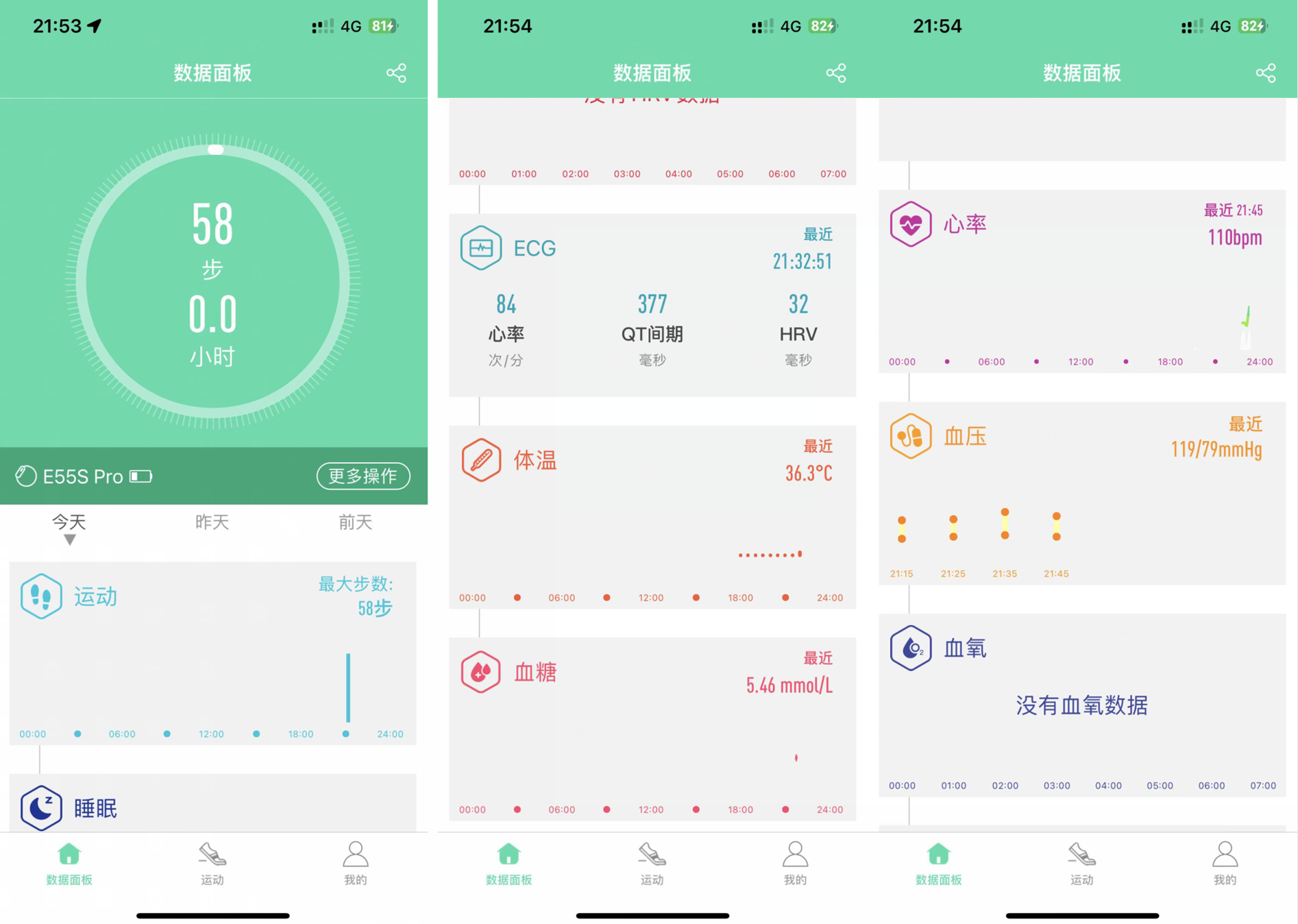 dido E55S Pro顶配版为实现更精准的健康监测,搭载了全新升级的HS6621芯片和STK8321加速度传感器,可以对ECG、血压、血糖、心率、血氧以及呼吸率等进行精准检测。虽然从专业准确度上来说,与专业的医疗设备有着一定的差距,但是可以为使用者的我们提供一个大概数据范围,对自身的身体健康状况能有一定的了解和认知。