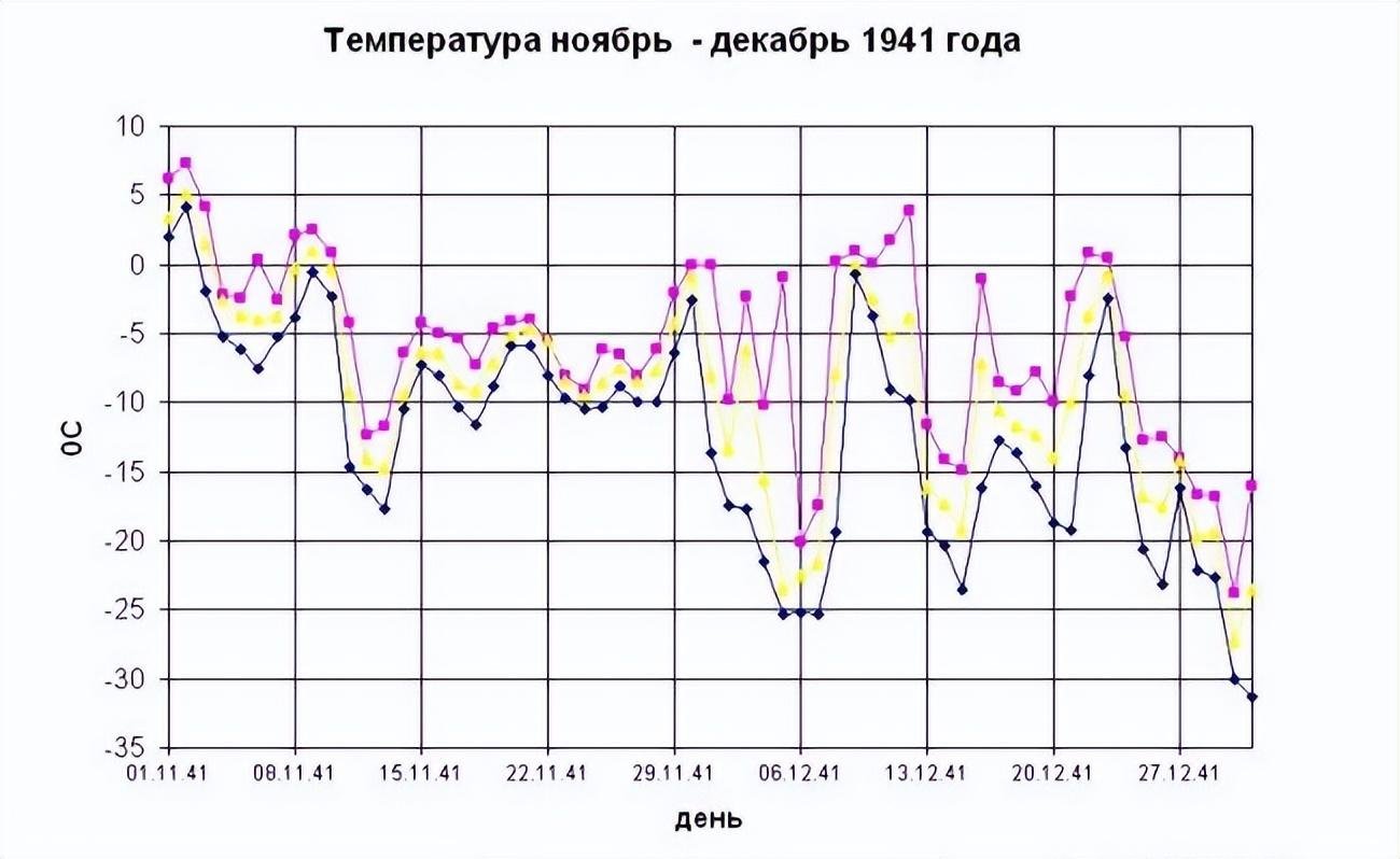1941年11月份是德军向莫斯科挺进的时间,而德军进攻迟滞,是在1941年12月初,等到12月5日开始,苏军的预备队集结完毕,开始了反攻。而莫斯科气温骤降,达到一个极寒天气,则是12月6日开始的,但是紧跟着,莫斯科的气温开始回升了。但是这会儿,苏军已经是反攻进行中了,德军已经开始后撤了。