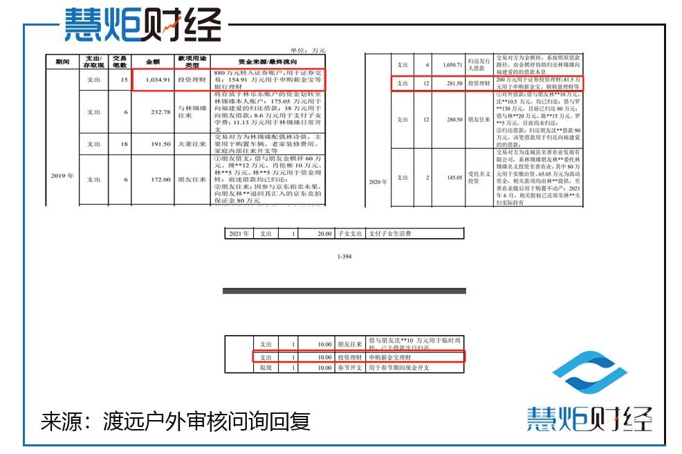 据渡远户外审核问询函显示,2019 年林锡臻投资理财支出1,034.91万元,其中,880 万元转入证券账户,用于证券交易;154.91万元用于申购薪金宝等银行理财。