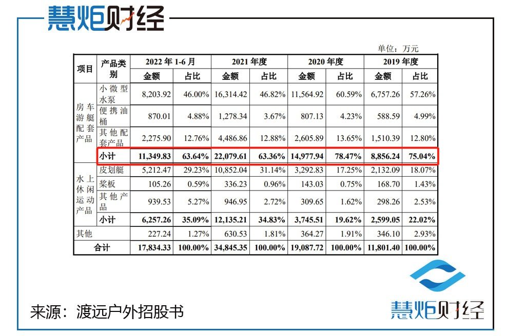 招股书显示,渡远户外主要从事房车游艇配套产品和水上休闲运动产品的研发、设计、生产和销售,核心产品主要是房车游艇常用的小微型水磅、便携式油桶等配套产品,以及皮划艇等水上休闲运动产品。