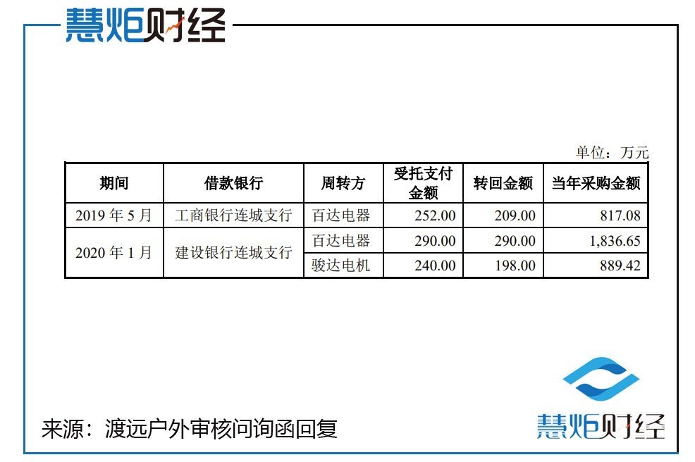 招股书显示,渡远户外前五大供应商中,余姚市百达电器有限公司、余姚骏达电机有限公司为主要的电机供应商,报告期内向其采购合计占采购总额的比例分 别为 34.29%、31.82%、21.75%和 23.74%。而这两家供应商在报告期内曾存在配 合渡远户外进行转贷的情况,这两家公司的注册资本仅为50 万元和 7 万美元。