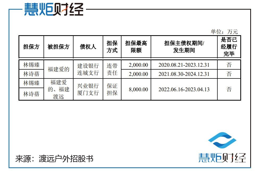 渡远户外表示,除为发行人子公司银行贷款增信担保外,林锡臻未对外提供其他担保,不存在大额未清偿债务经核查,为加强子公司向银行贷款的增信,实际控制人林锡臻及其配偶为发行人子公司福建爱的、福建渡远向建设银行、兴业银行的贷款提供连带责任保证担保。目前,福建爱的、福建渡远向建设银行、兴业银行的贷款未出现逾期还款等需要林锡臻或其配偶承担担保责任的情形。根据林锡臻出具的书面声明,除上述为发行人子公司向银行贷款提供连带责任保证的情形外,林锡臻未对外提供其他担保。