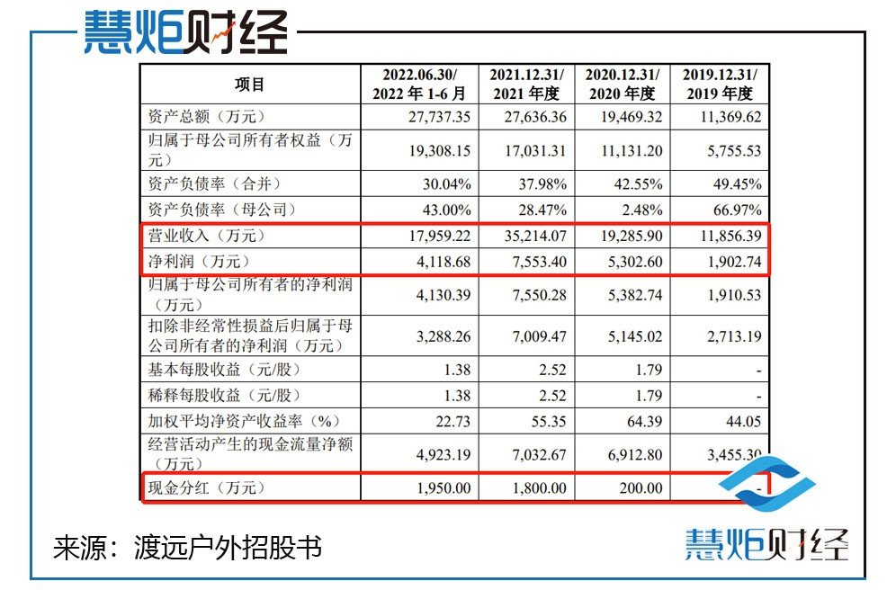 招股书显示,2019-2021年及2022年上半年,渡远户外营业收入分别为1.19亿元、1.93亿元、3.52亿元、1.80亿元,归母净利润分别为1910.53万元、5382.74万元、7550.28万元、4130.39万元。