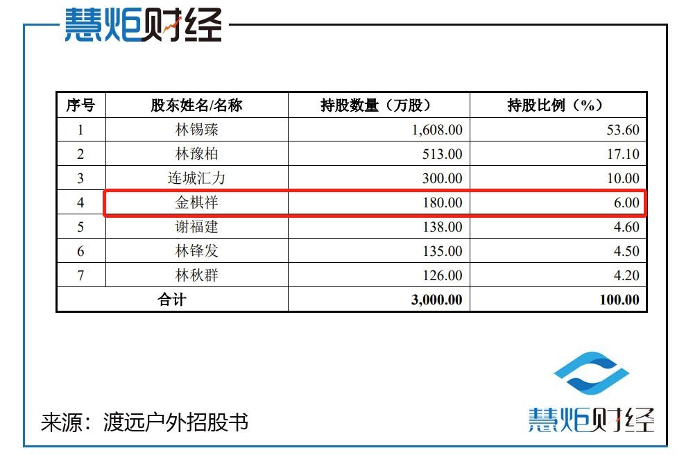 问询函披露,金棋祥持有 6%股份,其与实际控制人林锡臻系多年朋友兼合作伙伴关系,自 2011 年以来长期工作生活在渡远户外主要生产基地所处的福建省连城县,并于 2017 年 10 月前担任子公司福建爱的经理,后因事业重心调整等个人原因离职。