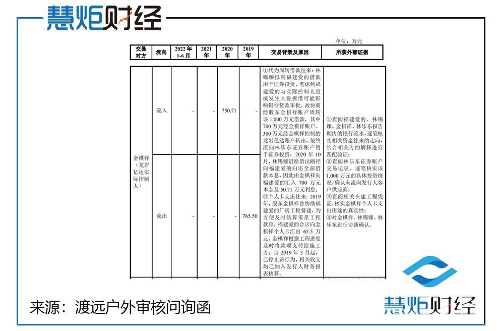 渡远户外表示,林锡臻拟向福建爱的借款用于证券投资,但考虑到福建爱的与实际控制人直接发生大额拆借可能影响银行贷款审批,协商经股东金棋祥账户周转该 1,000 万元借款,其中 700 万元经金棋祥账户、 300 万元经金棋祥控制的龙岩亿达账户转出,最终流向林乐东证券账户用于证券投资;2020 年 10 月,林锡臻沿原借出路径向福建爱的归还全部借款本息,因此由金棋祥向福建爱的汇入 700 万元 本金及 50.71 万元利息;