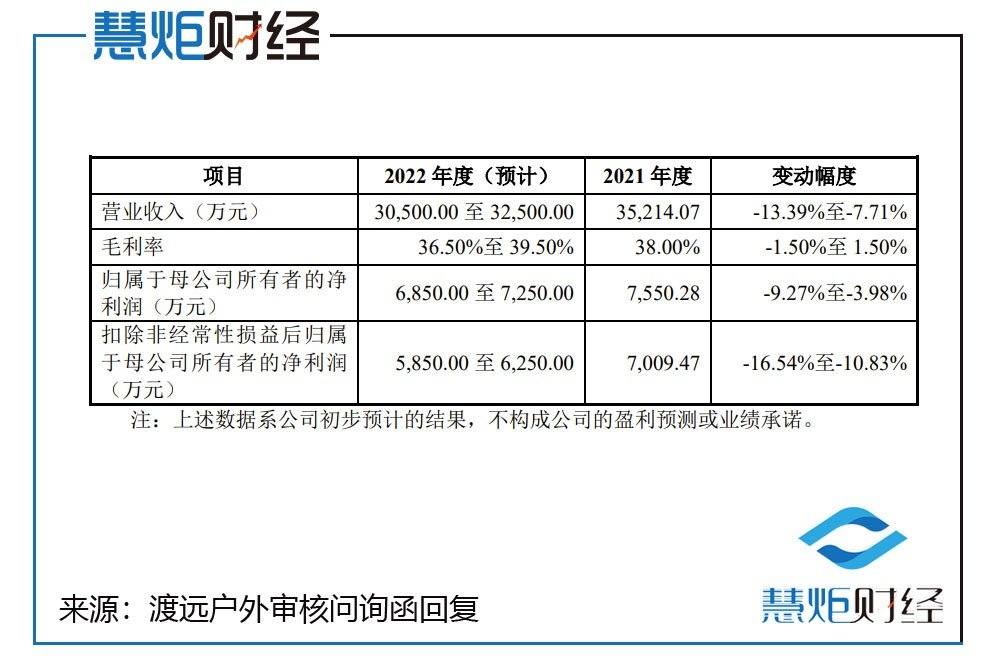 此外,在问询回复函中,渡远户外预计2022年收入为30,500.00万元-32,500.00 万元,较 2021 年下跌 7.71%至 13.39%。受收入下跌的影响,2022 年扣除非经常性损益后归属于母公司所有者的净利润为 5,850.00 万元-6,250.00 万元,较 2021 年下跌 10.83%至16.54%。