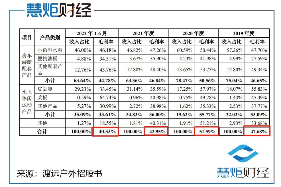 渡远户外主要收入来源于房车游艇配套产品,该产品2019-2021年及2022年上半年的营业收入分别为0.89亿元、1.50亿元、2.21亿元、1.13亿元,占主营业务收入的比例分别为75.04%、78.47%、63.36%、63.64%。