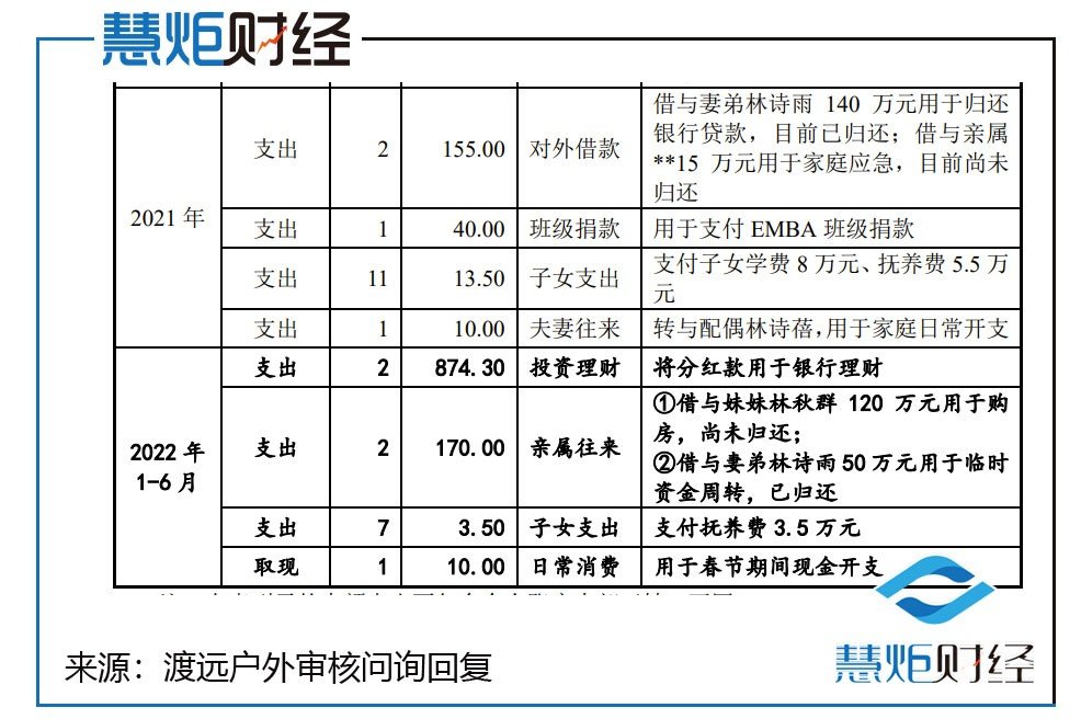 据问询回复函显示,2019年-2022年上半年,林锡臻支出主要包括日常消费、对外借款、班级捐款、投资理财等。值得注意的是,2021年支付 EMBA 班级捐款40万元。