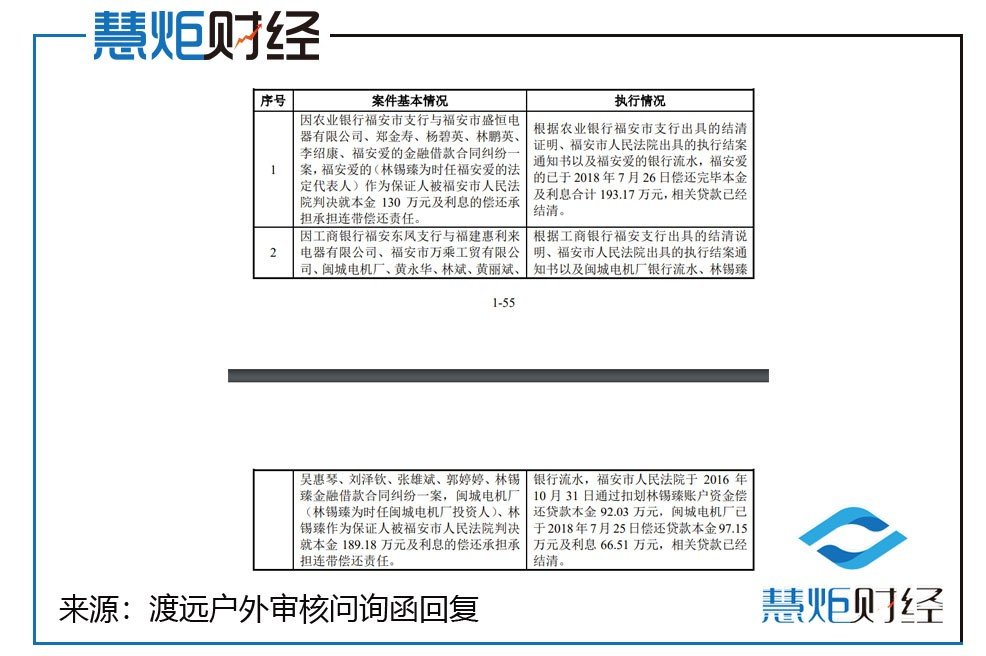 问询函显示,林锡臻曾涉及财务纠纷涉案,主要是两起事由,一是因农业银行福安市支行与福安市盛恒电器有限公司、郑金寿、杨碧英、林鹏英、 李绍康、福安爱的金融借款合同纠纷一案,福安爱的(林锡臻为时任福安爱的法定代表人)作为保证人,被福安市人民法院判决就本金 130 万元及利息的偿还承担连带偿还责任。根据农业银行福安市支行出具的结清证明、福安市人民法院出具的执行结案通知书以及福安爱的银行流水,福安爱的已于 2018 年 7 月 26 日偿还完毕本金及利息合计 193.17 万元,相关贷款已结清。