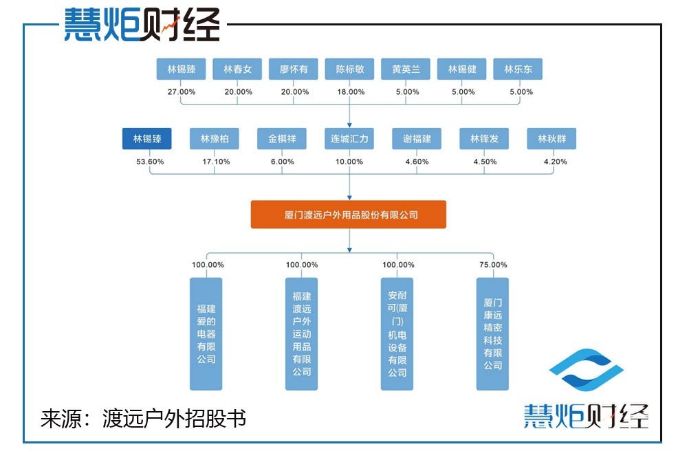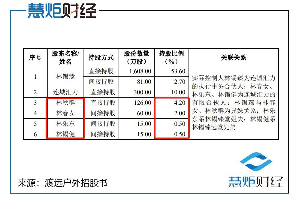 另外,招股书披露,林锡臻有两个妹妹:林秋群与林春女,其中,林秋群直接持有渡远户外4.20%的股份,任公司总经理助理;林春女通过连城汇力间接持股2.00%,在核心子公司福建爱的担任销售经理。另外,林锡臻的堂姐夫林乐东、林锡臻的远堂兄弟林锡健各持股0.50%。