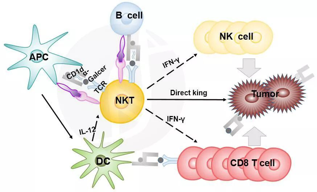 NKT细胞是一群细胞表面既有T细胞受体TCR,又有NK细胞受体的特殊T细胞亚群。树突状细胞(DC细胞)找到癌细胞的抗原后,就会带回去交给辅助性T细胞,这个过程叫做”抗原呈递”。辅助性T细胞发现是癌细胞后,马上召唤细胞毒性T细胞和天然杀手细胞(NK细胞),要求它们以最快速度抹杀癌细胞。