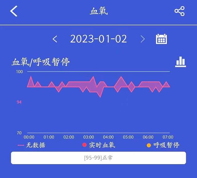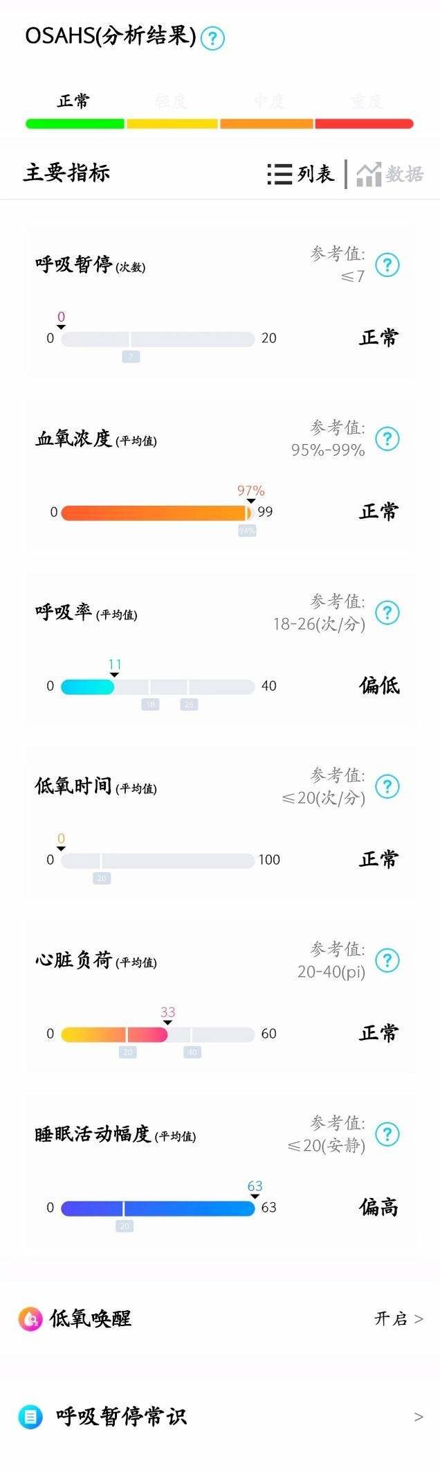 这是我1月2日监测的情况,血氧浓度平均值为97%,属于正常水平。其他呼吸暂停、低氧时间、心脏负荷也都是正常,呼吸率偏低、睡眠活动幅度偏高。值得一提的是,在底部有一个低氧唤醒功能,开启后,如果监测到夜景血氧值持续过低,影响到身体健康,设备就会做出报警通知。