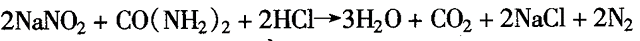 将尿素用盐酸酸化后,使亚硝酸根转化为氮气而除去: