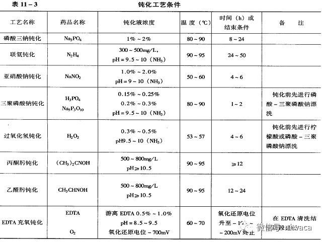 磷酸盐钝化形成黑色钝化膜,但会给系统引入有害物质,钝化膜耐腐蚀性较差,在高温下易被损坏,故仅适用于中、低压锅炉。