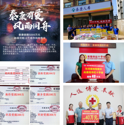 2021年7月20日,河南省多地遭遇极端强降雨,郑州市降雨量突破历史极值。泰康保险集团第一时间启动突发事件应急预案,紧急调动全集团资源,快速开展应急工作,全力助力政府及社会各界防汛救灾,紧急宣布通过泰康溢彩公益基金会捐款5000万元。