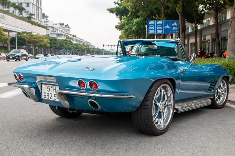 雪佛兰Chevrolet C2 Stingray 拥有蓝色油漆,配有黑色条纹,以突出亮点,以及更换或重新抛光明亮的镀铬细节。该车还由肖特的Fuel d.concave托盘拥有独特的设计,在蓝色和明亮的镀铬两个色调中完成,前18英寸和后20英寸,配备飞镖式心锁螺。