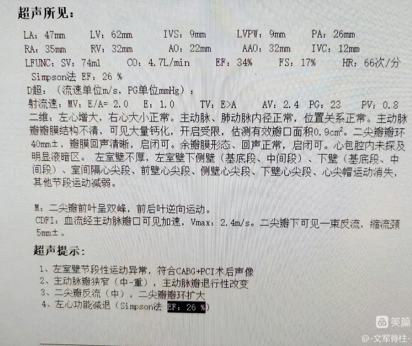 入院后,一查心脏彩超,结果吓医生一跳!B超显示:李奶奶的心脏已经饱经沧桑:二尖瓣中度反流、主动脉瓣重度狭窄、左心室失代偿性扩大......更可怕的是心功能严重减退,射血指数EF只有26%,而通常EF要达到40%才能耐受麻醉,且老人还有多年糖尿病病史!