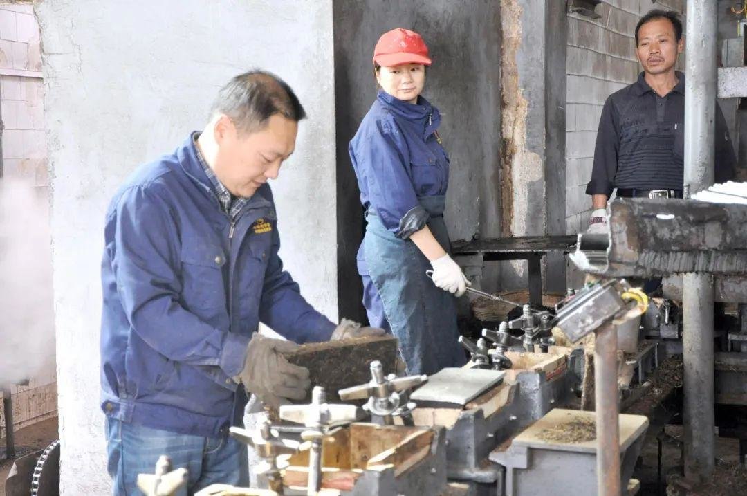 赵李桥砖茶制作技艺传承至今已有六代,作为土生土长的咸宁赤壁人,陈军海从小就接触了这项刻在赤壁人血液里的技艺。“茶鲜叶采割后,经杀青、揉捻、日晒制成老青茶,再经渥堆发酵、复制、蒸压、包装等工序而成青砖茶,共需6大工艺,72道工序。”