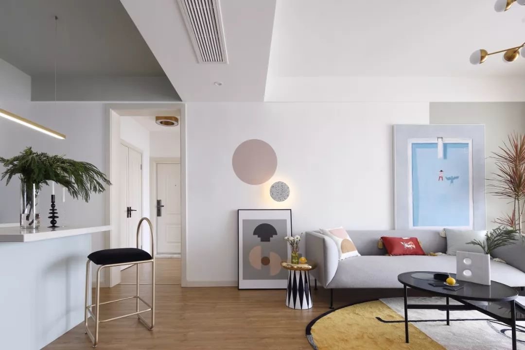 3、在家居上:可采用几何图案抱枕、棉麻地毯、简约台灯、装饰画来装饰。