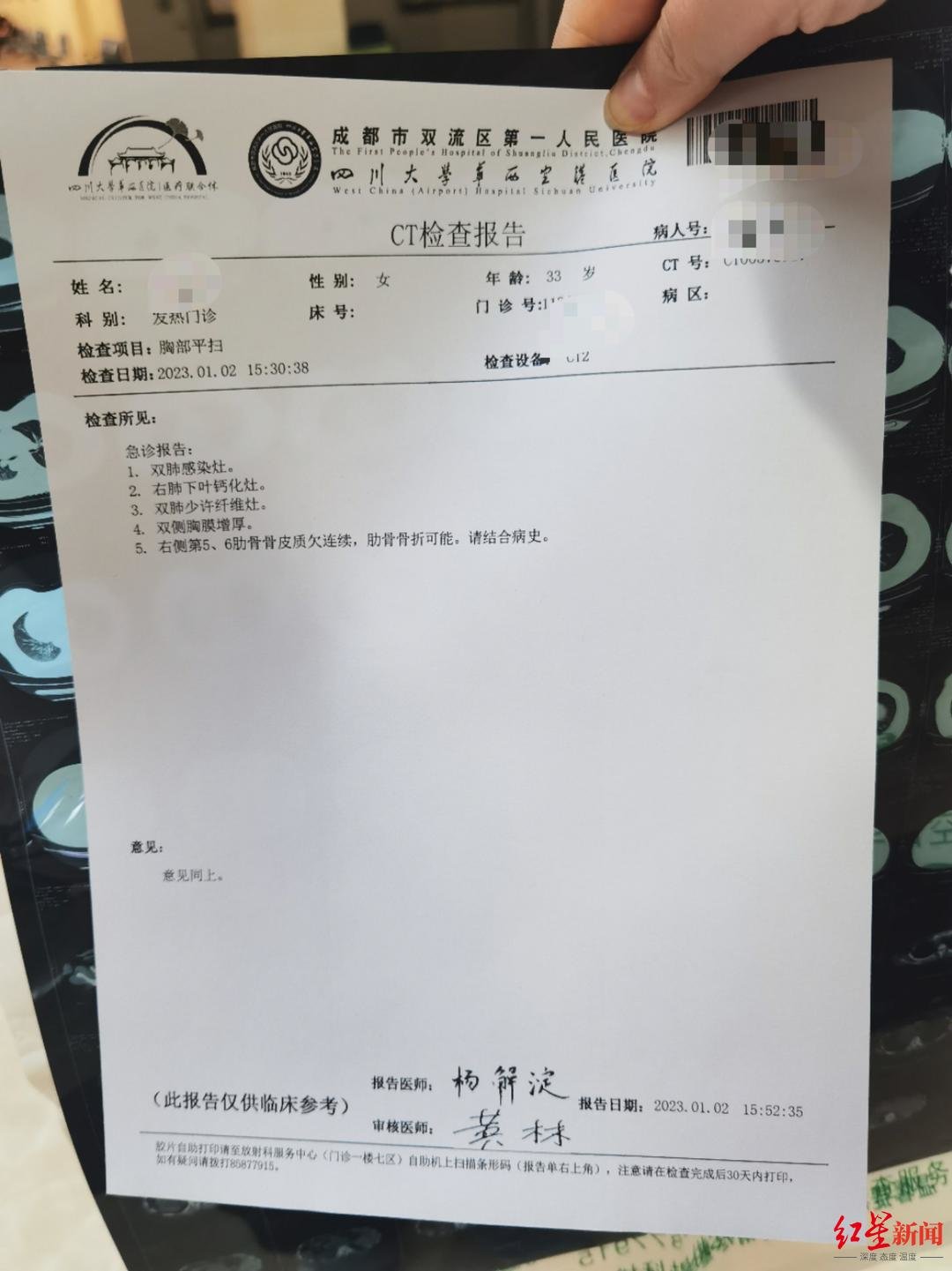 1月2日,杜女士在成都市双流区第一人民医院急诊科就诊时,医生为其做按压后,建议做胸部CT检查。当拿到CT报告时,杜女士感到不可思议,“有两根肋骨骨折了”。