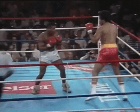 相反泰森的后手用的很少而且几乎是人扑过去,身体往一侧倾斜过去。这样彻底把重心压到拳侧还能顺势拉开位置躲闪对方的来拳。