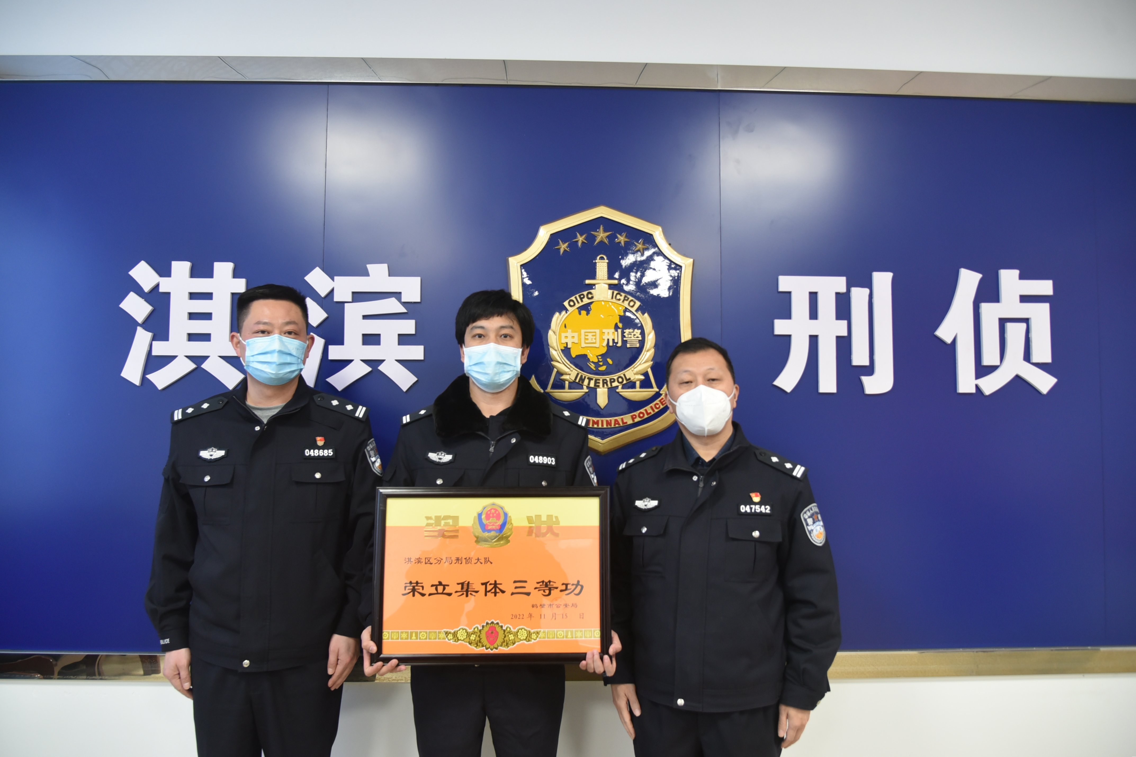 淇滨区分局党委班子成员分别来到刑事侦查大队、泰山路派出所等处,颁发集体三等功奖状,并为荣立个人三等功的高冬、杨慧等同志颁发奖章、证书,勉励受到表彰奖励的同志珍惜荣誉、锐意进取、再接再厉、再创佳绩。
