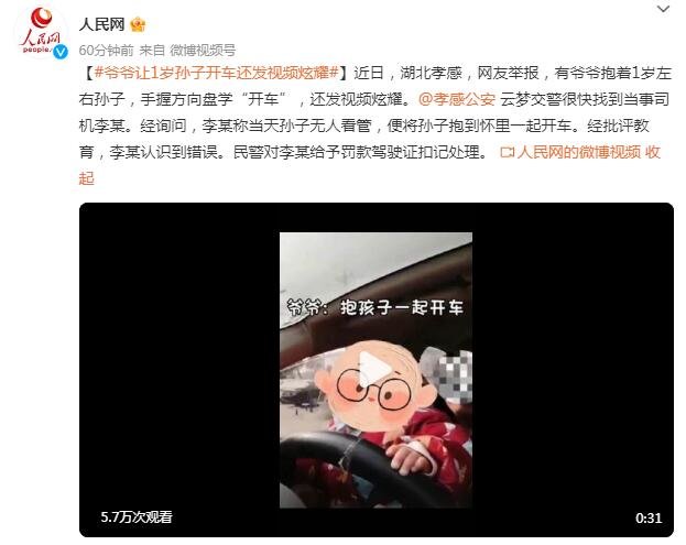 近日,湖北孝感,网友举报,有爷爷抱着1岁左右孙子,手握方向盘学“开车”,还发视频炫耀。孝感公安云梦交警很快找到当事司机李某。经询问,李某称当天孙子无人看管,便将孙子抱到怀里一起开车。经批评教育,李某认识到错误。民警对李某给予罚款驾驶证扣记处理。