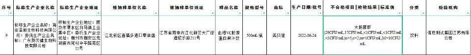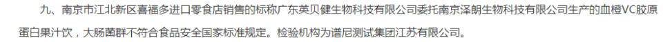 南京市江北新区喜福多进口零食店销售的标称广东英贝健生物科技有限公司委托南京泽朗生物科技有限公司生产的血橙VC胶原蛋白果汁饮,大肠菌群不符合食品安全国家标准规定。检验机构为谱尼测试集团江苏有限公司。