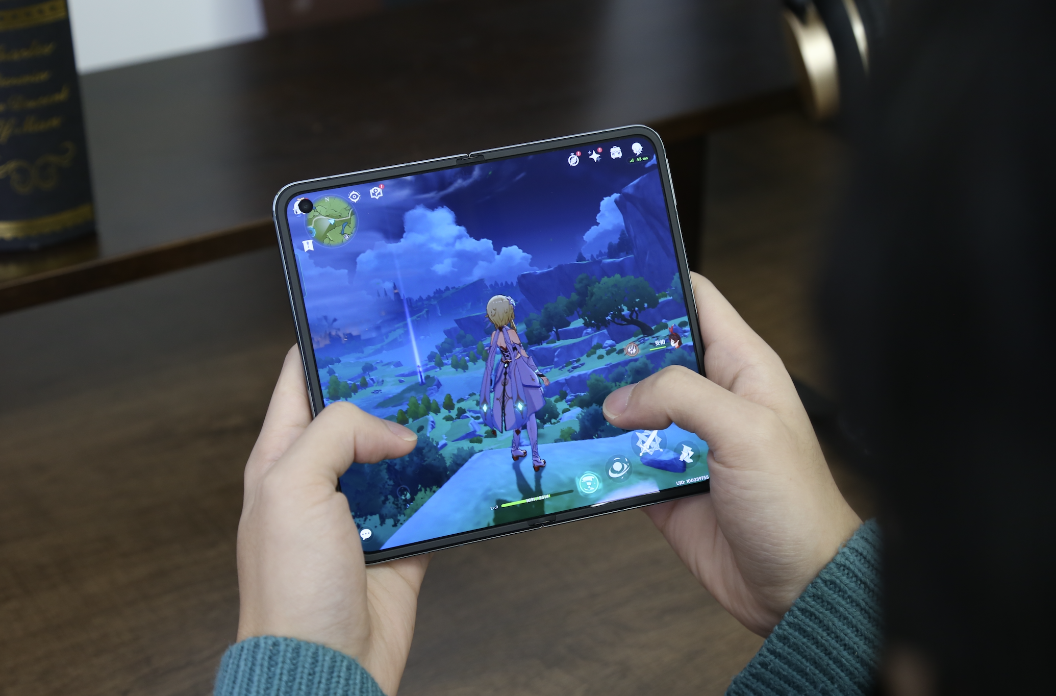 这块超大屏拿来玩手机游戏感觉有点“作弊”毕竟视野也变大了,能看到普通手机看不到的地方。加上骁龙8+处理器和ColorOS 13系统,玩《原神》流畅度杠杠的,半小时后机身温热,但没到烫手地步,感觉是真的能当主力机使用。