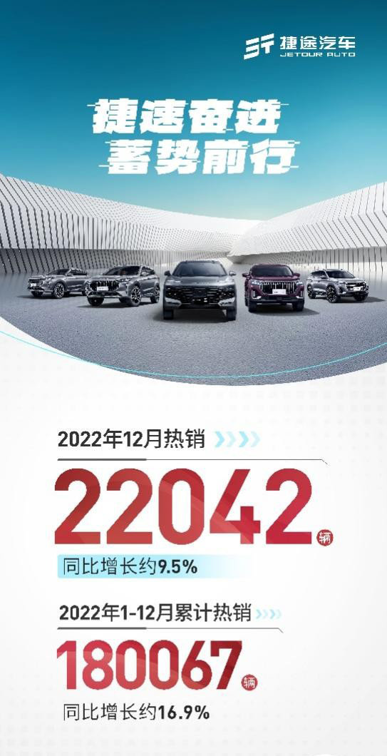 2022年,中国车市受疫情与“缺芯”等国内外因素影响,前行之路并不平坦,但捷途汽车逆势而行,保持了稳健的增长。捷途汽车2022年12月销量达22042台,同比增长9.5%;支撑2022全年实现销量18万+辆,同比增长17%,市占率连续12个月保持增长;品牌发布至今,捷途汽车已累积了全球64万+用户和2300万粉丝,创造中国新锐SUV品牌增速第一和中国自主品牌中大型SUV销量第一,持续刷新“捷途速度”,为品牌发展注入强大活力!